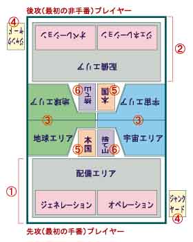 自已的UNIT(機體)、CHARACTER(人物)、OPERATION(任務)、GENERATION(國力)放置的場所。從對手玩家看的時候就變成敵軍配備 AREA。 (2)敵軍配備區 對手玩家的UNIT(機體)、CHARACTER(人物)、OPERATION(任務)、GENERATION(國力)放置的場所。對於對手玩家來說就變成自軍配備 AREA。 (3)地球區.宇宙區 戰鬥進行的區域。最初手番玩家的右側是宇宙區、左側是地球 區。在戰鬥階段,UNIT可以從地球區、宇宙區任一方或兩 方同時出擊戰鬥。這兩個區合稱「戰鬥 範圍」。 (4)墳場(JUNKYARD) 使用過卡片放置的地方。被破壞的Mobil Suit等也放在這裡。與丟牌處及本國不同,所有的卡片都是正面向 上放置的。 (5 )本國 彼此以背面向上放置的區。這裡的卡片沒有的時候,玩家 就輸了。 (6 )棄牌堆 給本國的傷害(DAMAGE)或是當資源使用掉的卡片都放在這裡。 所有的卡片都是背面向上放置的。 ※先攻玩家的右側是宇宙區。