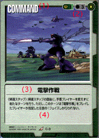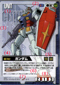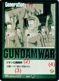 (機體與作戰使用所需的能源)的五種卡片所組成。 @玩家是,4個軍隊特徵和5種類的卡片組合成遊戲中所需要的軍隊。 |