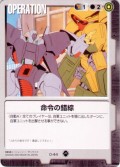 (自動B):這張卡片在被使用出場的場合,這張卡上放置3個指示物。 (常時):《◎》這張卡上的指示物1個移除。那個場合,自軍1枚機體是,回合終了之前得到+1/+1/+1。 這張卡上沒有指示物的場合,廢棄這張卡。 | ||